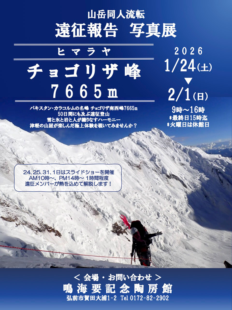 「山岳同人流転(るてん)」によるヒマラヤ・チョゴリザ峰(7665m)「遠征報告 写真展」開催!2025年6月14日~8月4日、山岳同人流転のメンバーがパキスタン・カラコルムの名峰 チョゴリザ南西峰へと遠征登山を行った際の報告写真展となります。1月24日(土)、25日(日)、31日(土)、2月1日(日)はスライドショーを開催、遠征メンバーによる解説もあります(10時~、14時~1時間程度予定)— 鳴海要記念陶房館公式Facebookページより引用