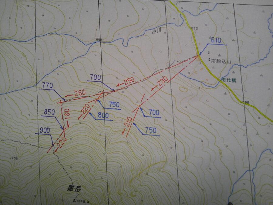 まず、事前に地形図を準備します。今回は夏道沿いに歩きますので、変化点(進む方向が変わる地点)の高度と進行方向を地形図に記載します。