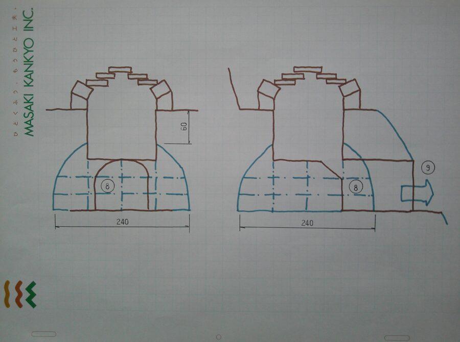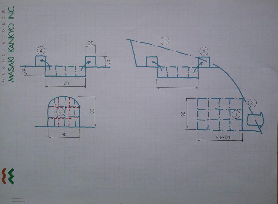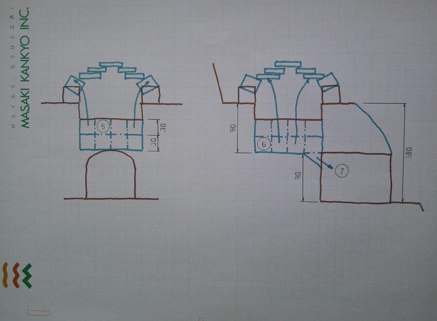 ・次に、屋根の基礎の強度を保つため、⑧基礎下から50~60㎝下げた位置から、竪穴を横に拡幅し、⑨出口から排出します。