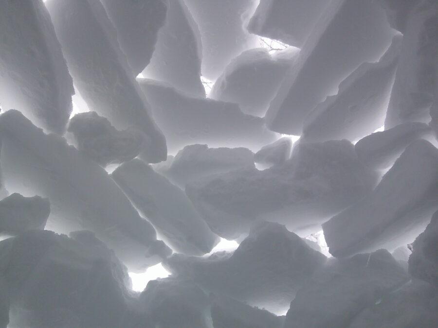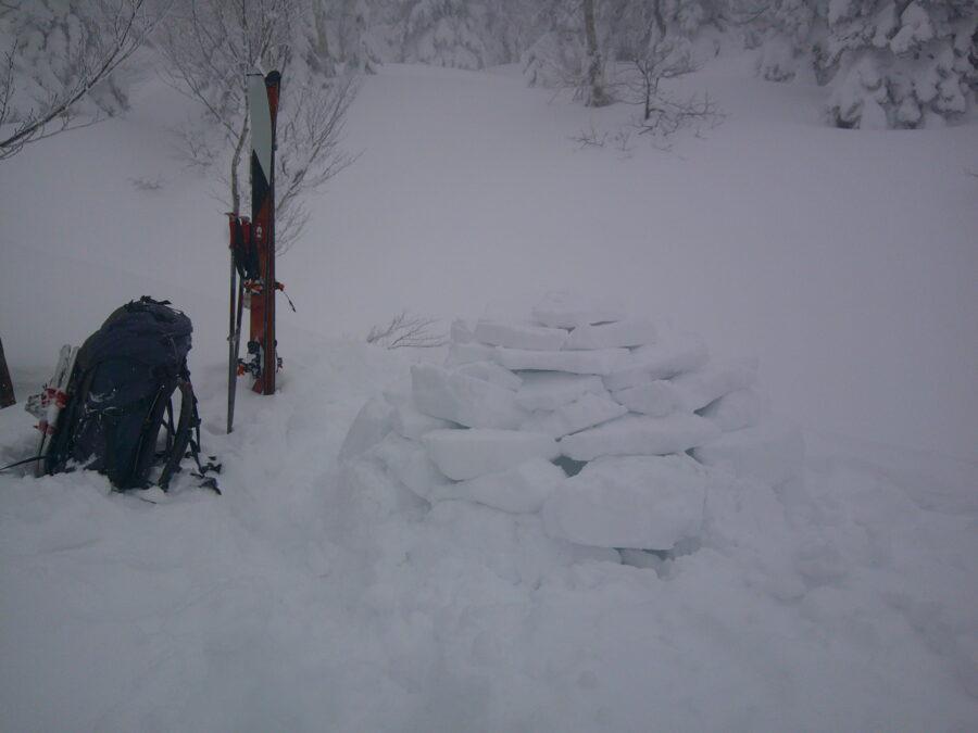 堀込式イグルは、どこでも造れるわけではありませんが、斜面に2~3m程度の積雪があれば、横穴式雪洞を掘るよりも短時間で容易に築造可能です。先日の大岳環状では、粉雪のため屋根掛けに時間を要しましたが、一人で約1時間で築造できました。堀込式は上から掘りますので、横から掘る雪洞と比べて、掘削の作業効率が格段に高いからです。