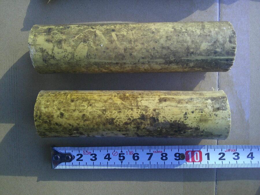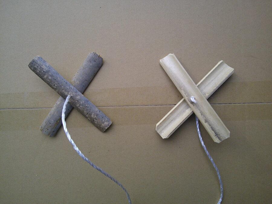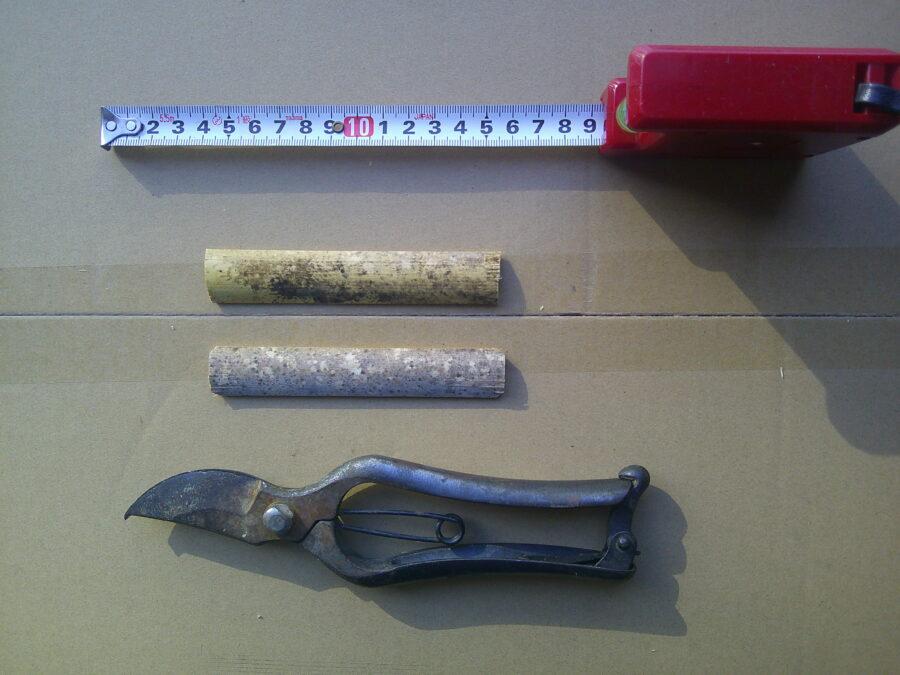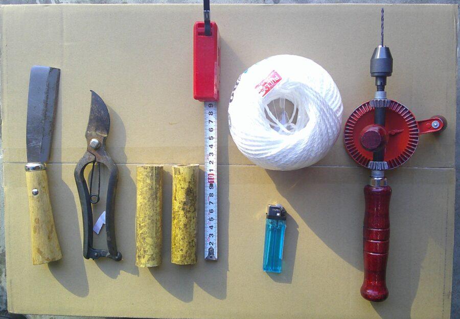 準備するものは、長さ12㎝、太さ4㎝程度の竹(ホームセンタで購入可)、竹を割るナタ、割った竹の隅を面取りする鋏、PSロープ、ライタ、竹に穴を開けるドリルです。