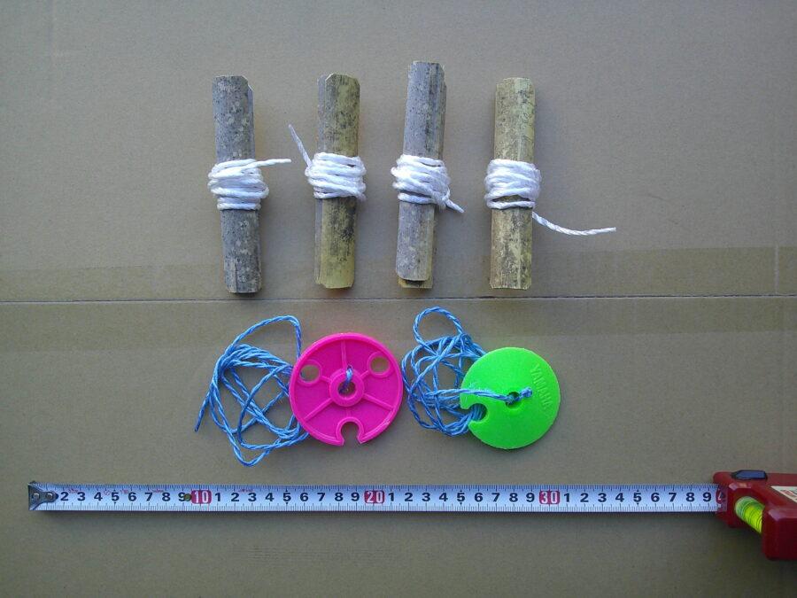 材料は竹でなくても自作できます。上の写真の赤と緑のプラスチックは、スポーツ店で販売している子供用スキーストックのバスケットです。これに穴を開けて自作し、使用しています。但し、アンカーとしての力は弱いので、テント泊では竹ペグ、日帰りのツェルト設営では、このバスケットを使用しています。