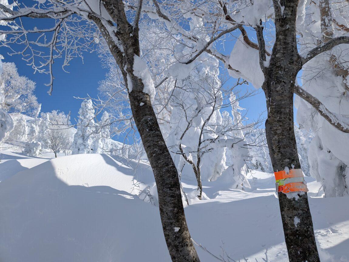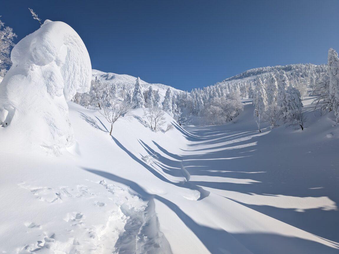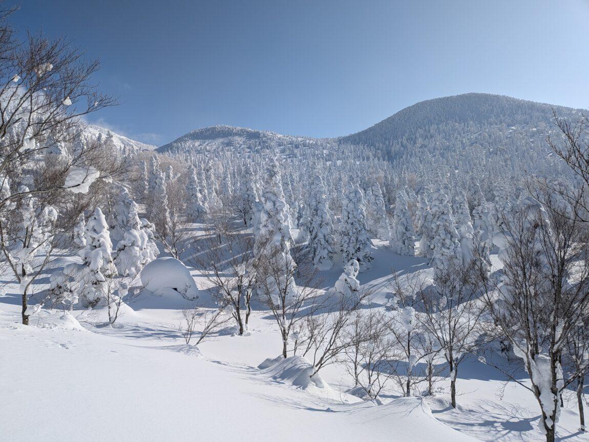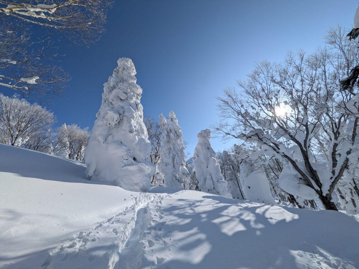 樹林帯途中からはトレースも無くなりひとり黙々と深雪ラッセルを満喫(笑)、青空やスノモン達に元気をもらいながら雪が緩んでくる前に一気にピークを目指す。