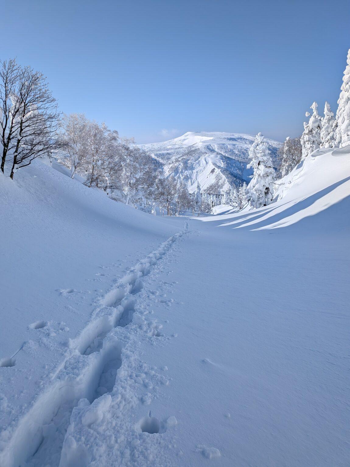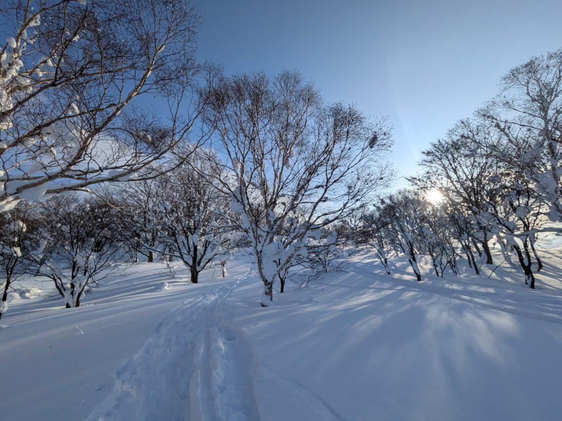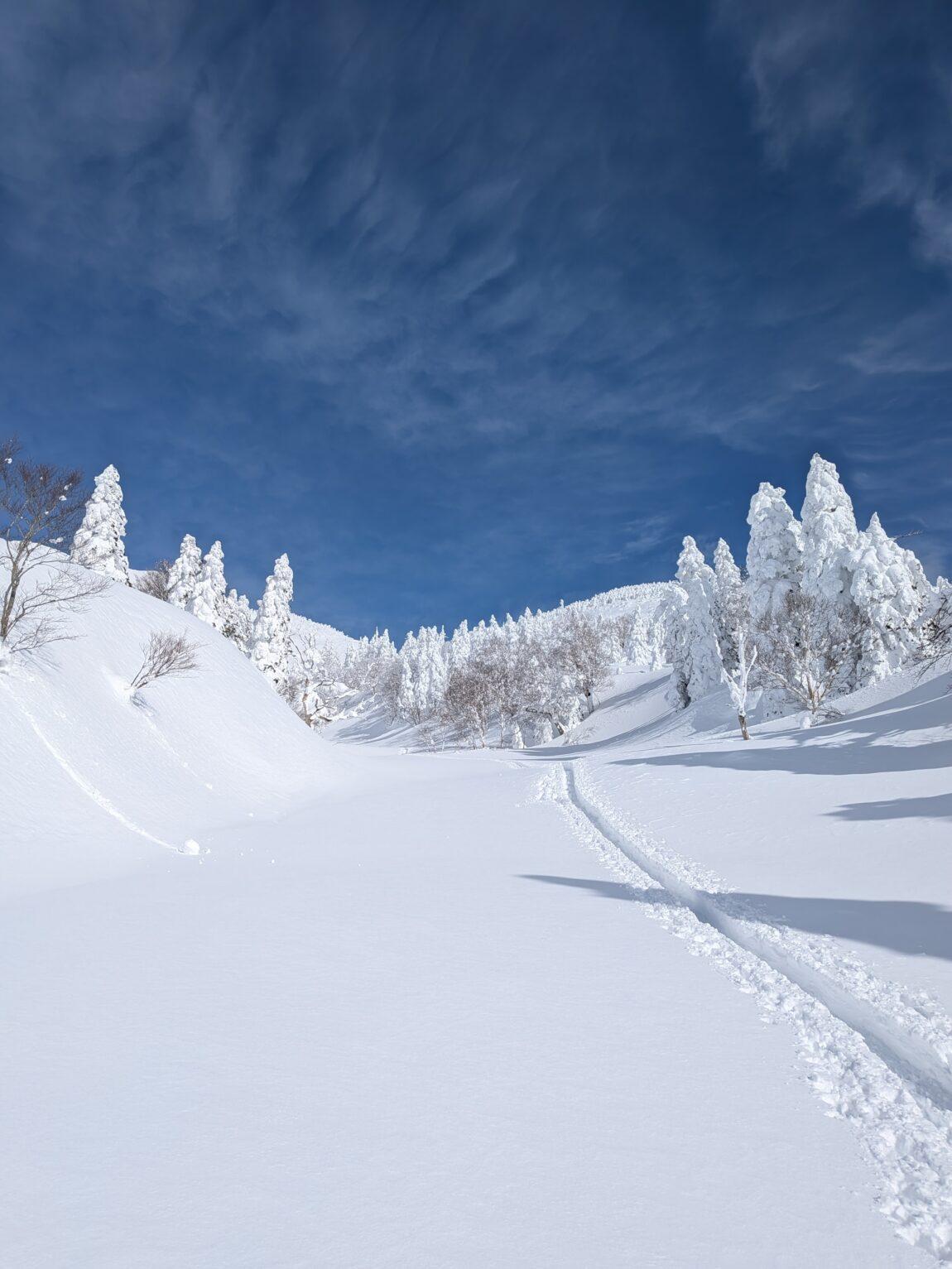 樹林帯途中からはトレースも無くなりひとり黙々と深雪ラッセルを満喫(笑)、青空やスノモン達に元気をもらいながら雪が緩んでくる前に一気にピークを目指す。