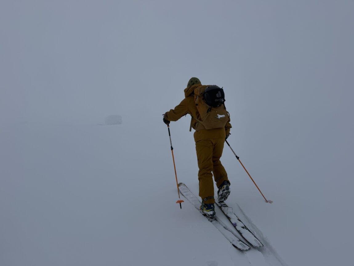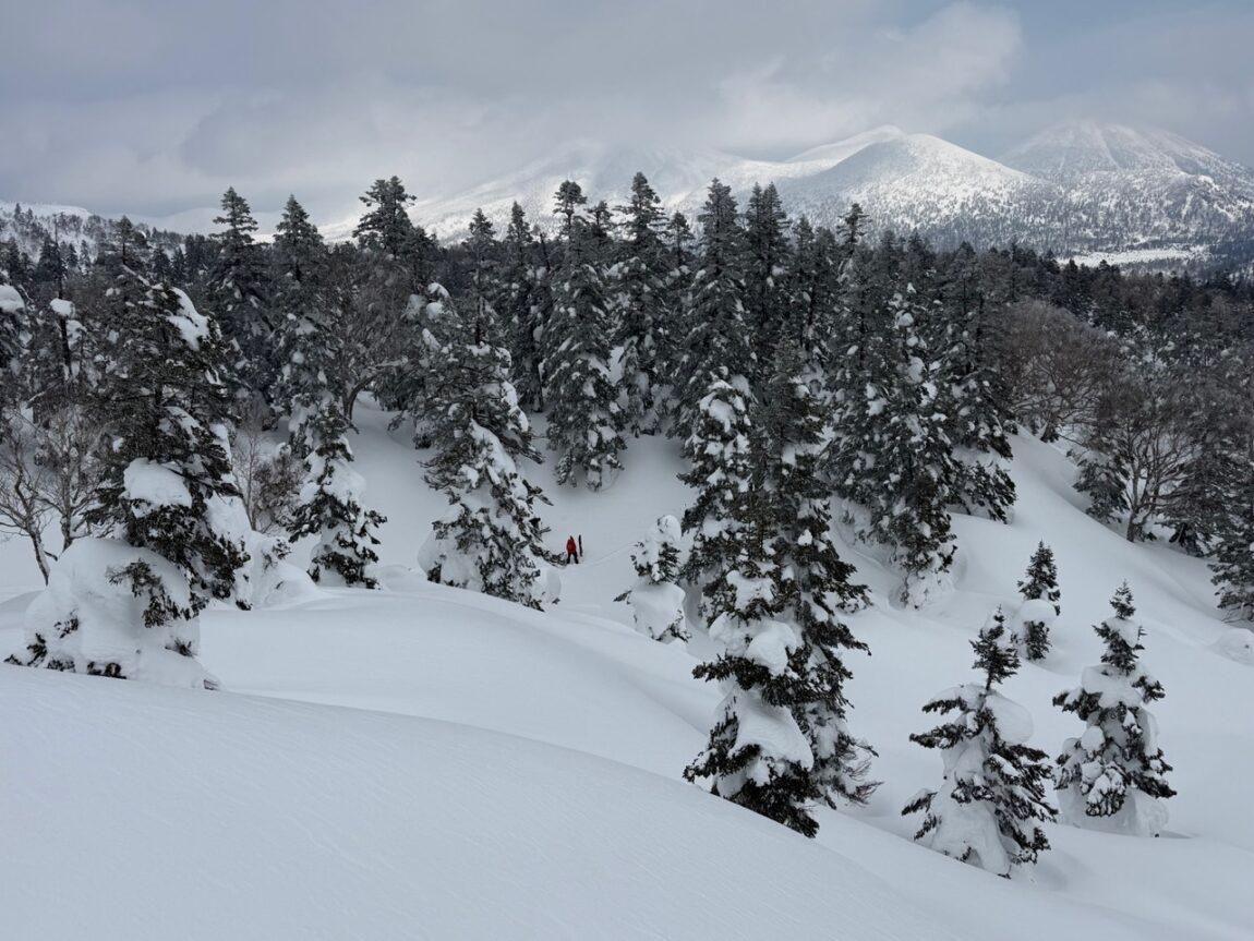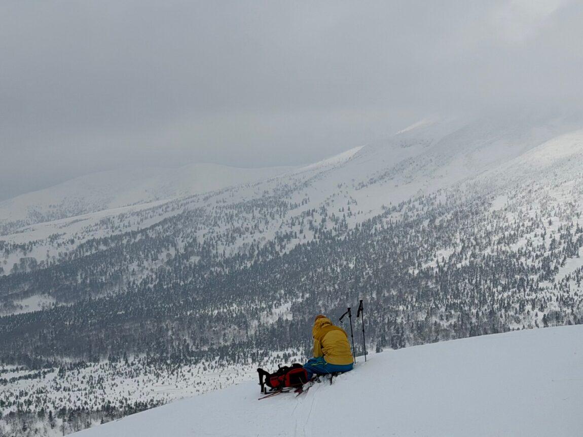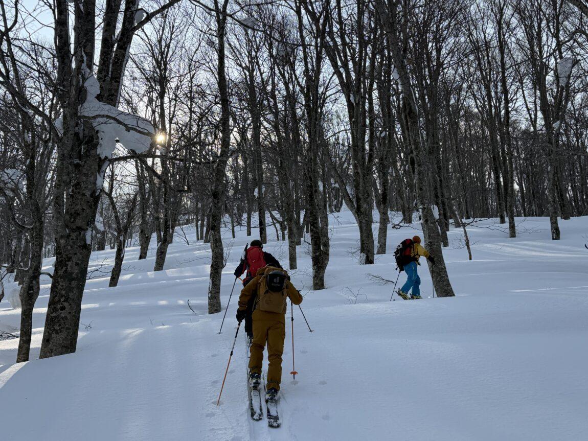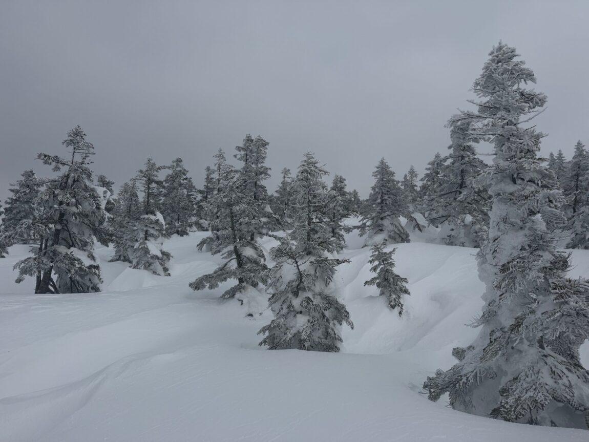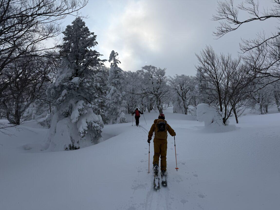 ラッセルというほどの新雪はなかったですが、サクサクと先頭を交代しながら進みます。みんな当たり前にコンパス歩行して良い感じ。O谷さんは最後までGPSを見ずに、ホワイトアウトや細かいアップダウンも何のそので、ばっちりの場所に皆を導いてくれました。