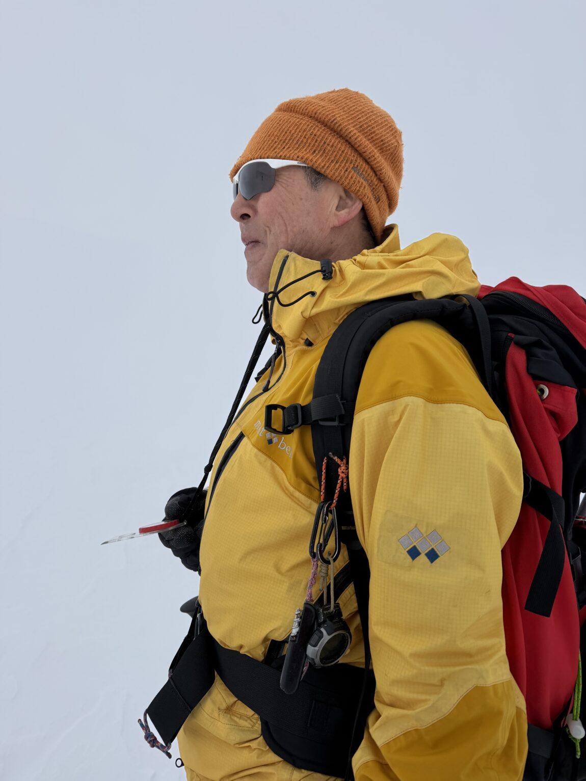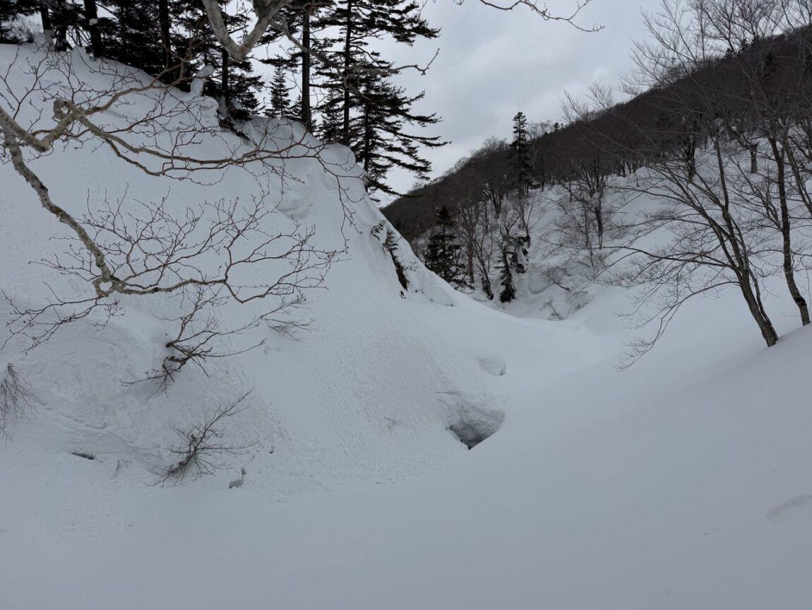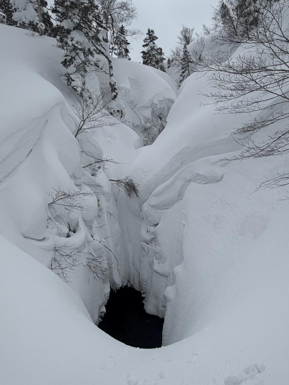 雪崩たり吹き込んだりして、沢底には7mは雪が積もっているそうです。ここにテント泊して、この穴から水を汲むのだとか。サバイバル!