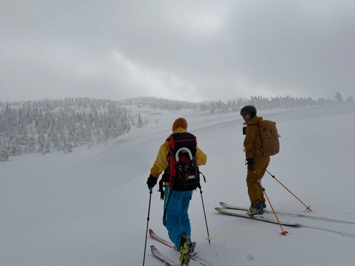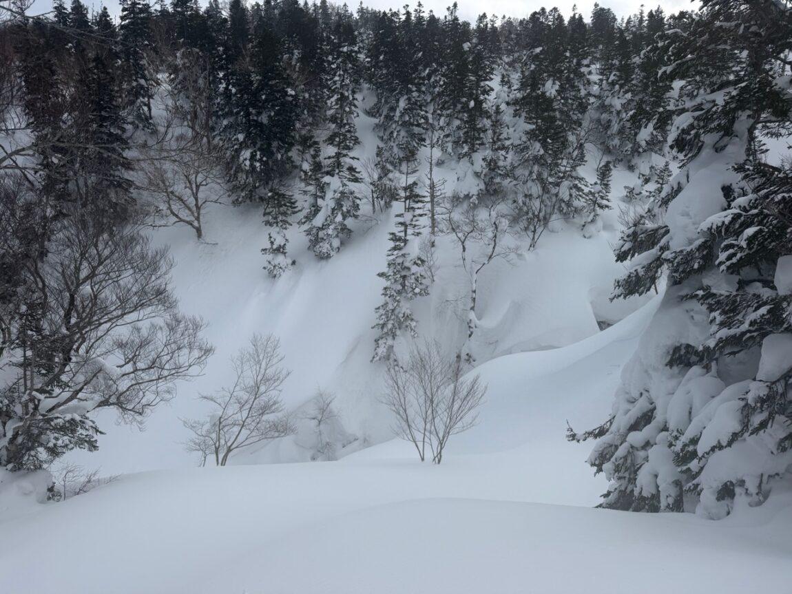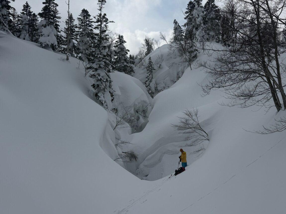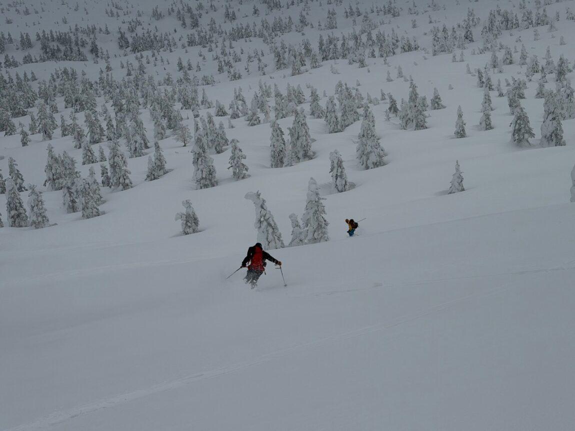 横岳の東斜面を一瞬の視界回復とともに滑ります。O谷さんとは先日モヤでスキーをご一緒させてもらったとき、ありえないほど上手くて驚いたのですが、この日はカービングではない細くまっすぐな昭和のスキーでさらに驚きました。Sさんも飛び入り参加のOさんもみなスキーがかなり上手!そのまま逆川へ入っていきます。