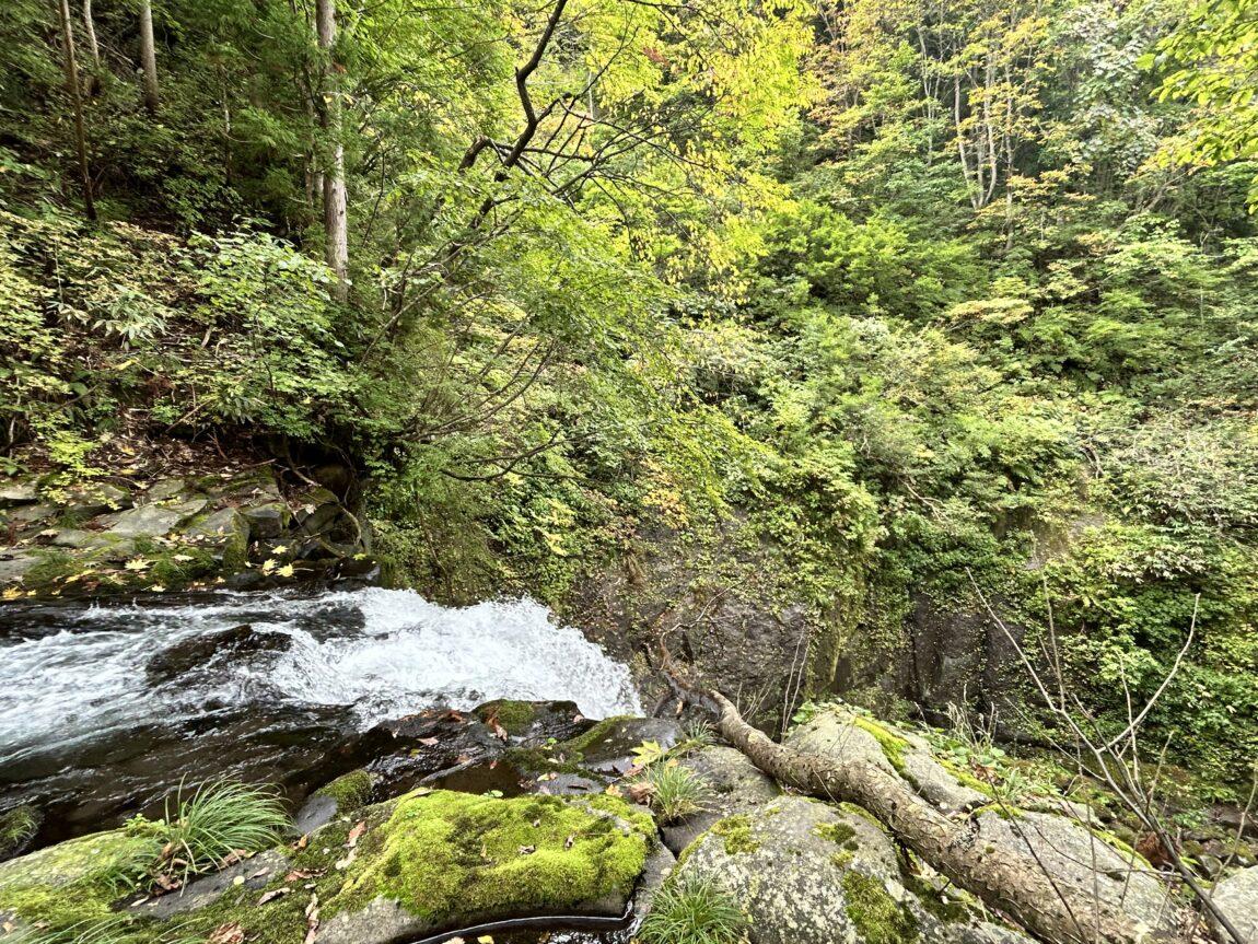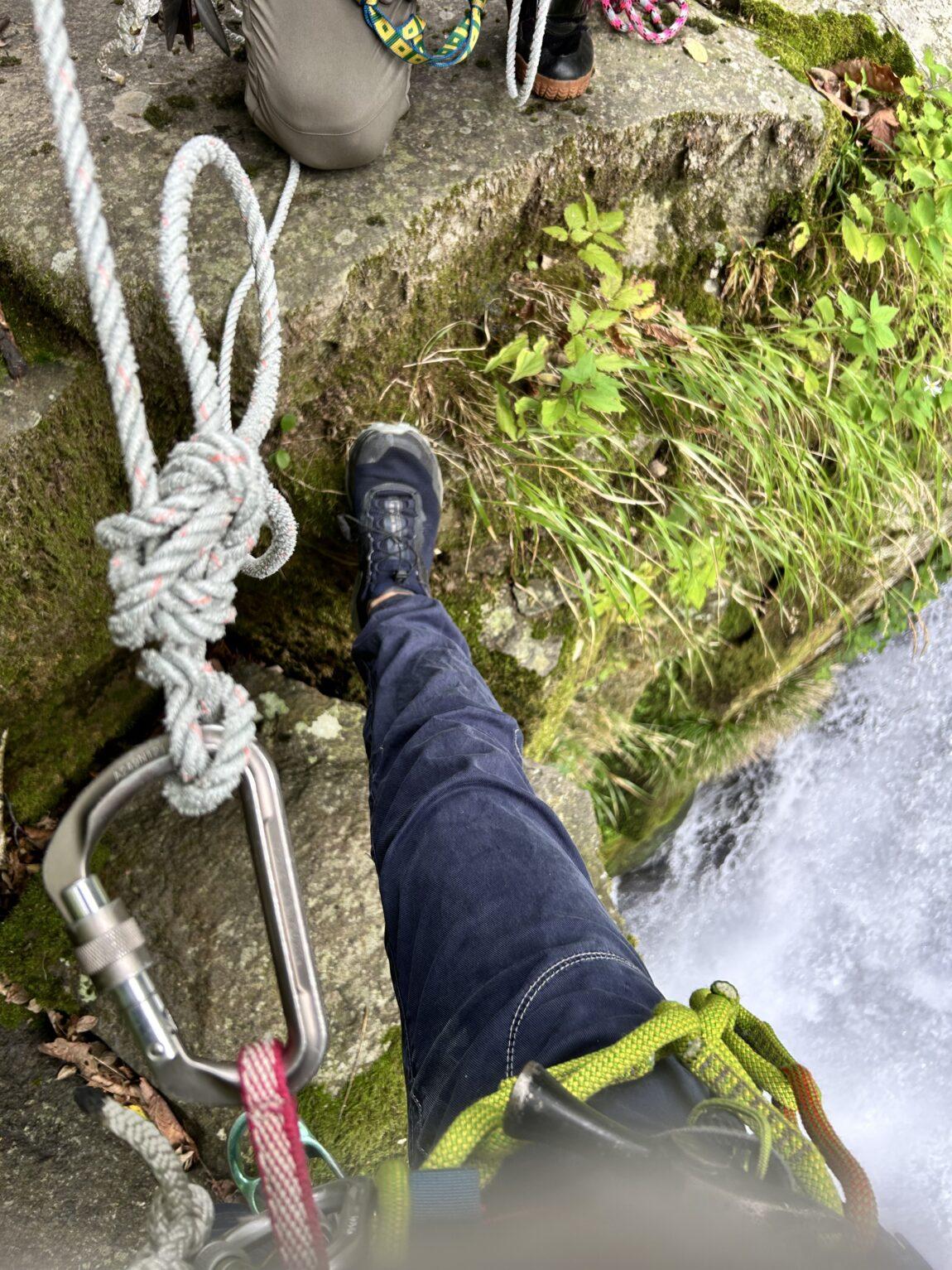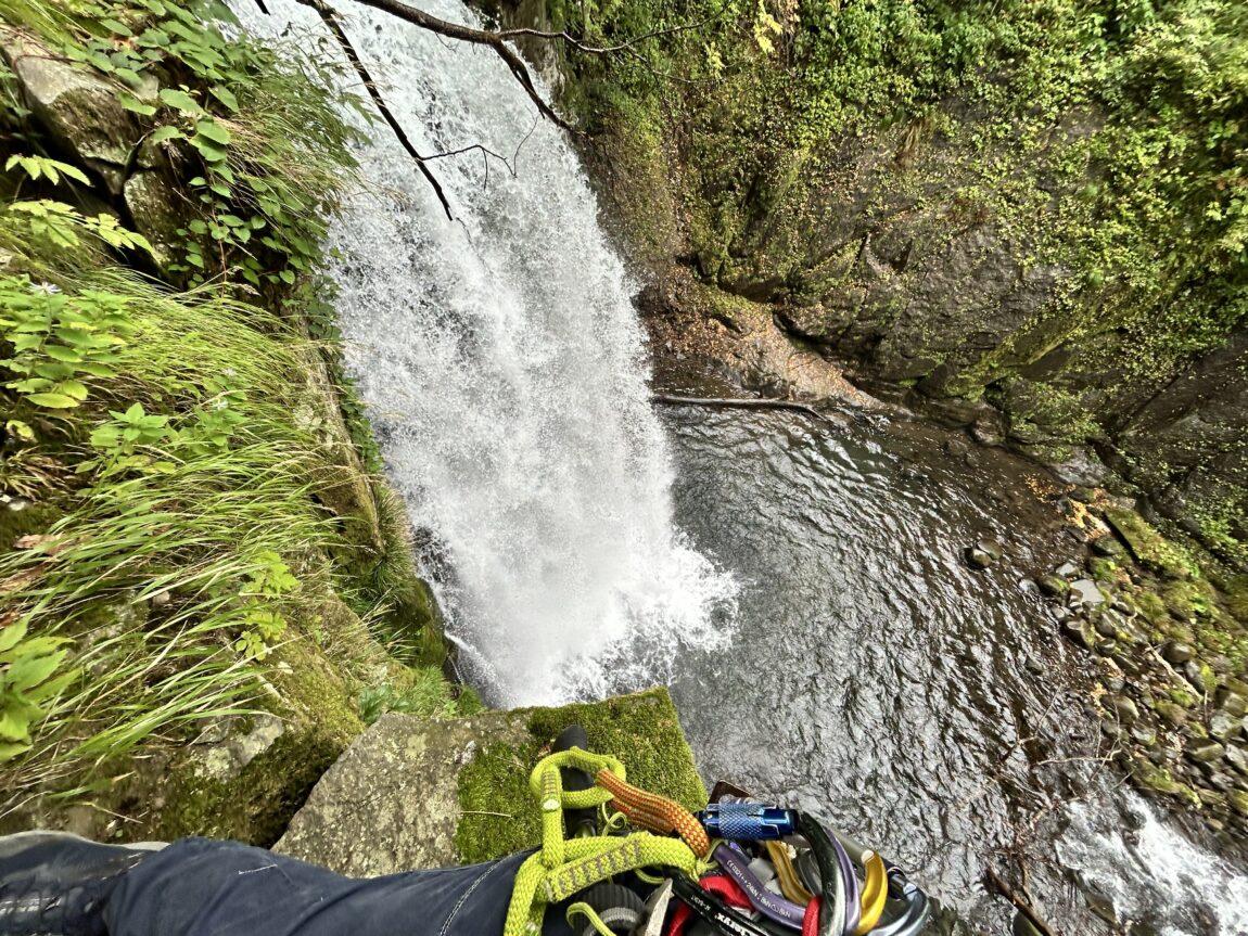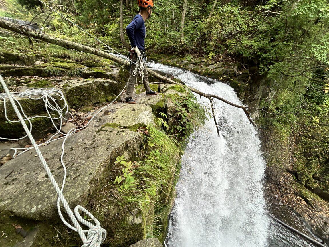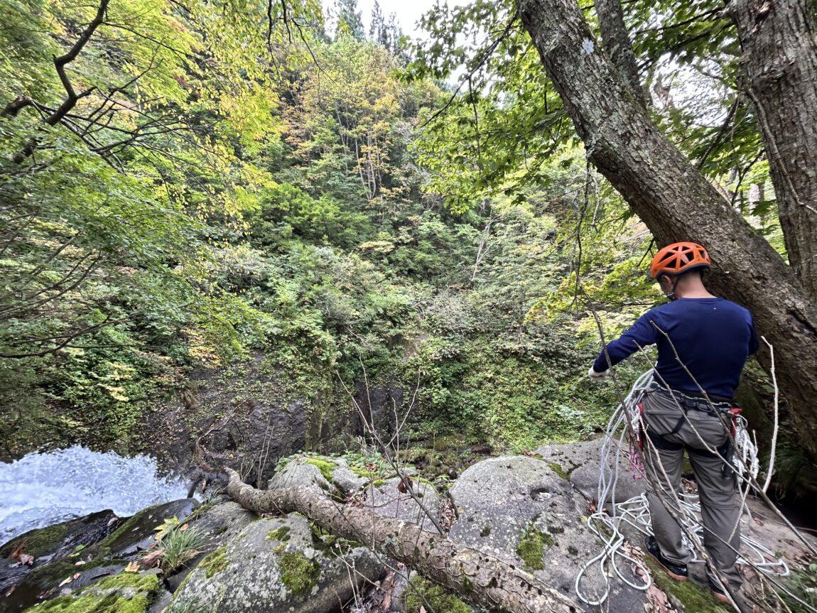 良い立木は必ずしも滝のすぐ近くにあるとは限りません。また、ビレイポイントの足場が良いとも限りませんし、ロープの余り具合や、水流への振られ防止も考慮しなければなりません。