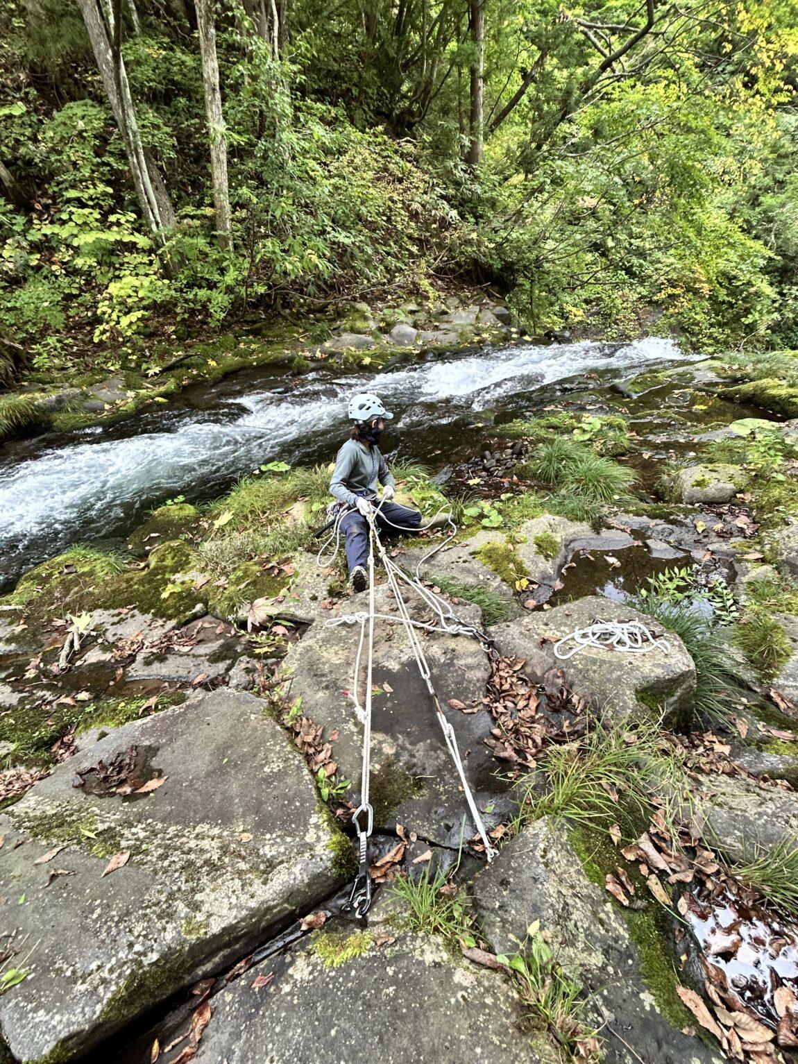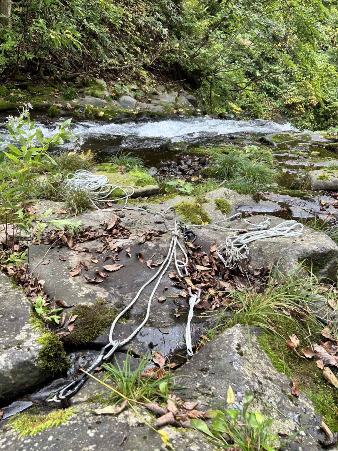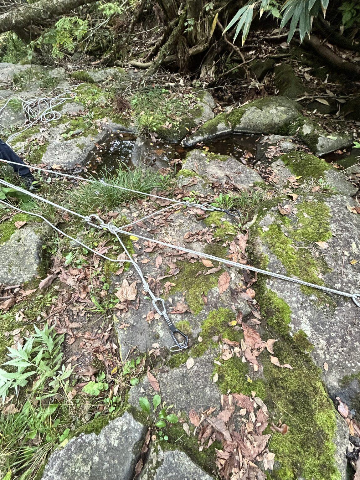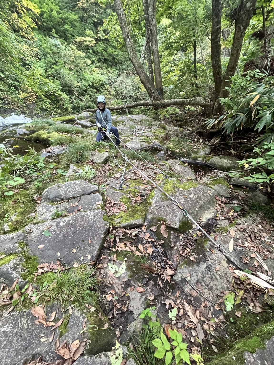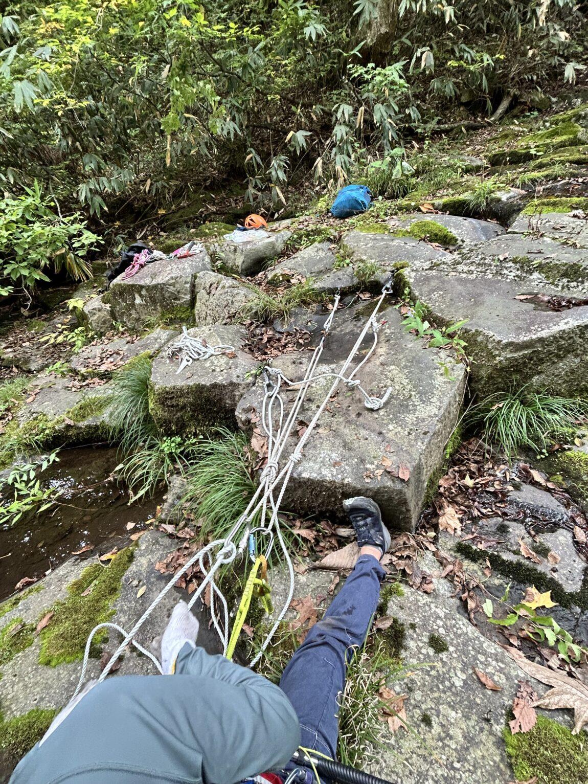 たがじょ沢登り部です!今日は外岩練習に向かったものの、予想外の雨に見舞われ、どうしようかとアプローチ道をウロウロしていたところ、ちょうど練習を切り上げ撤収してきたOさんとばったり。場所を変え、沢登りロープワーク稽古となりました。
