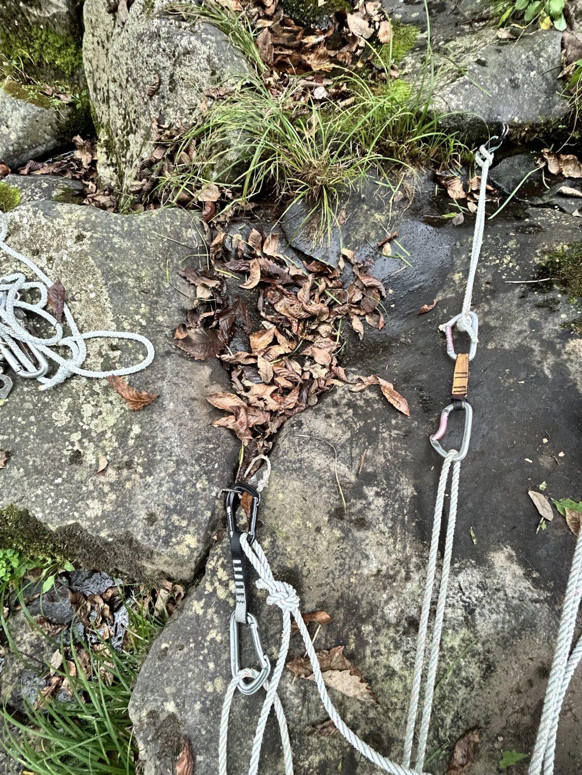 ハーケンは必ず2点+保険の3ヶ所必要とのこと。メインロープでセルフビレイを取り、さらに同じロープでクアッドアンカーをつくりつつ、片方はラビットノットで枝分かれさせて、計3点に繋ぐ…理屈はわかるのだけど、やろうと思うと全然上手くいかない!