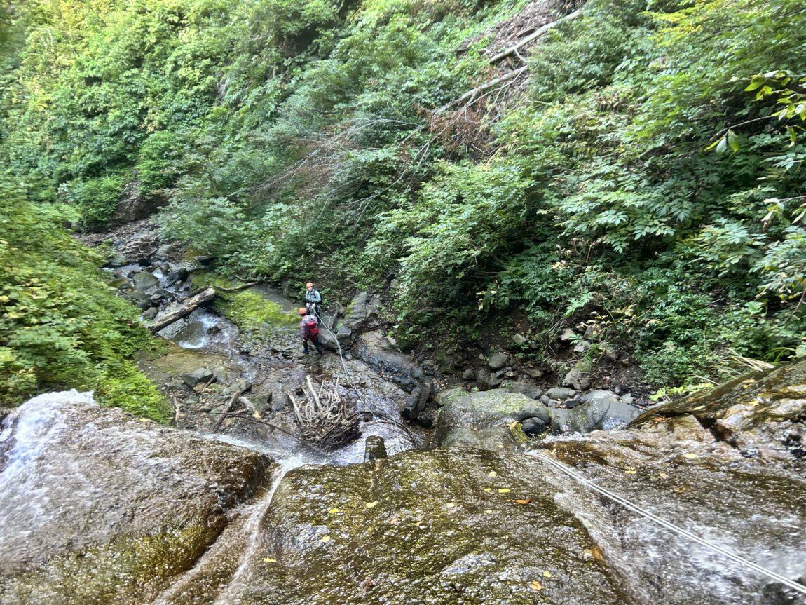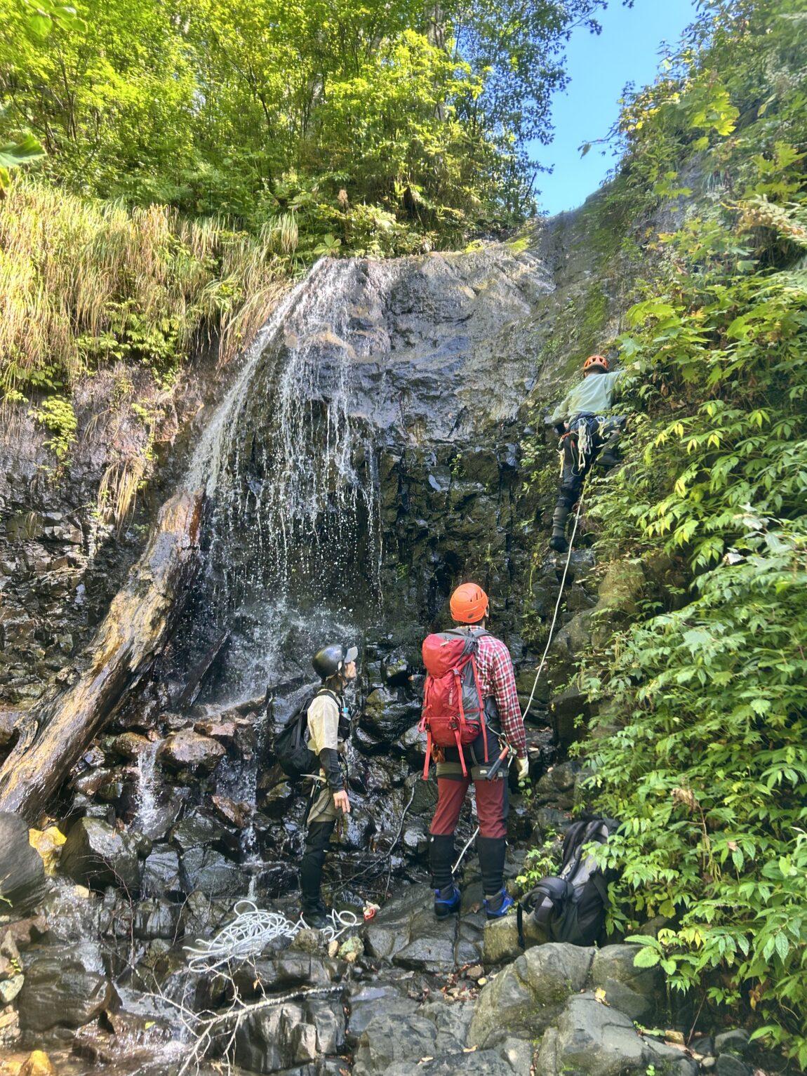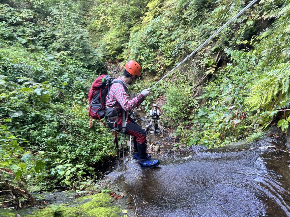 沢での懸垂下降はバリエーションが本当に多い。まずは支点をどこからどのように取るか。ロープの長さは足りるのか。使う器具やバックアップの有無。その時々の最適解を考えるのは楽しい。現場では教科書のやり方は通用しないことも多く、o谷さんは毎回さまざまなパターンを教えてくれる。この日3回目の懸垂下降では、私はバックアップのマッシャーを効かせすぎてスムーズに降下できず、悔しかった。次こそは。
