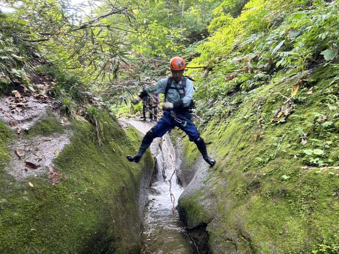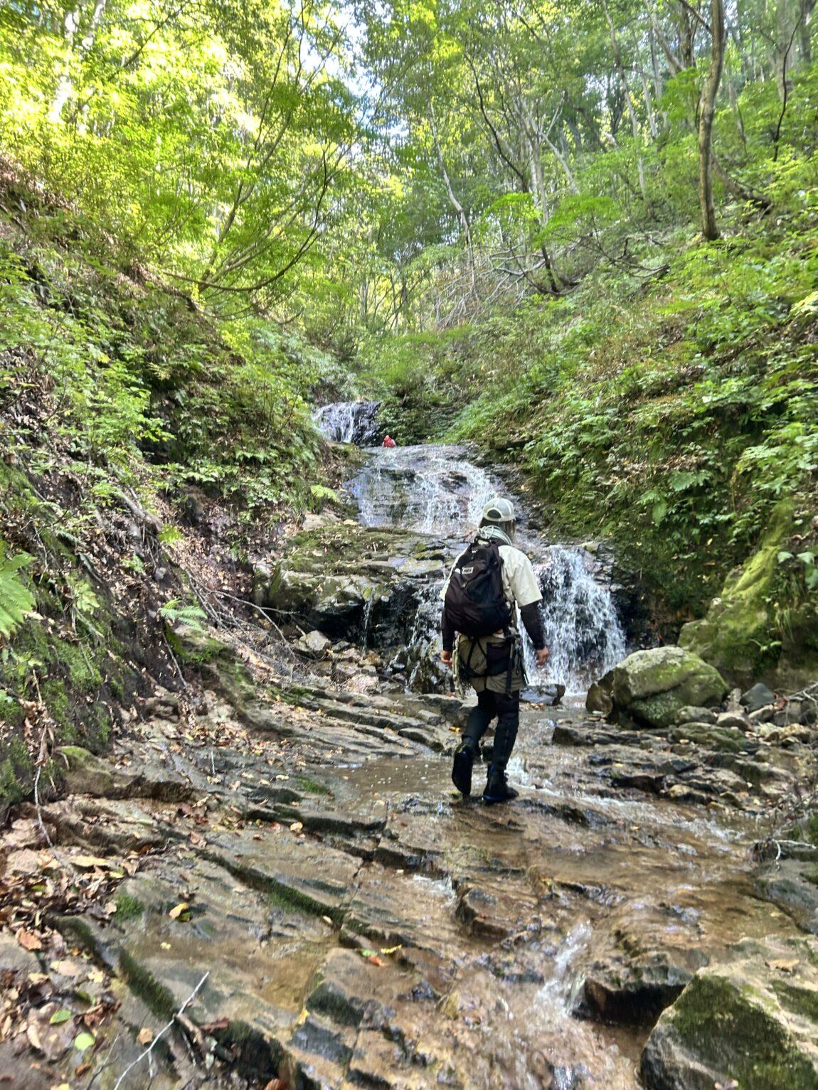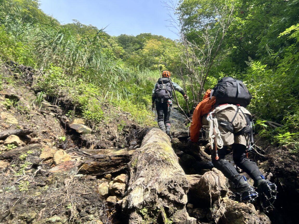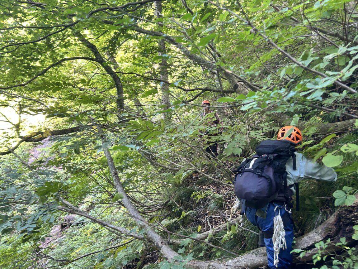 沢での懸垂下降はバリエーションが本当に多い。まずは支点をどこからどのように取るか。ロープの長さは足りるのか。使う器具やバックアップの有無。その時々の最適解を考えるのは楽しい。現場では教科書のやり方は通用しないことも多く、o谷さんは毎回さまざまなパターンを教えてくれる。この日3回目の懸垂下降では、私はバックアップのマッシャーを効かせすぎてスムーズに降下できず、悔しかった。次こそは。