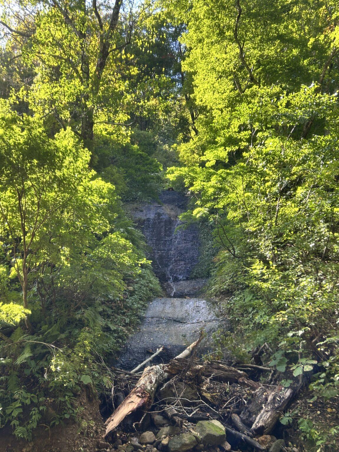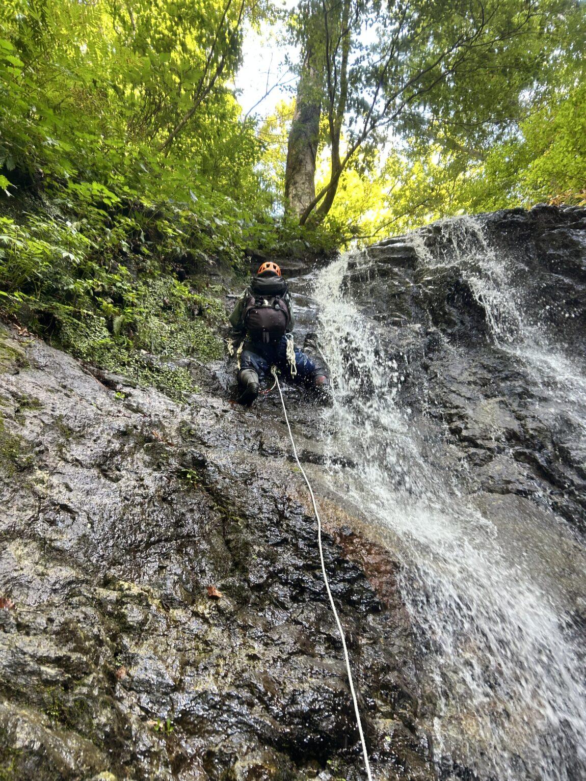 10mくらいの滝が現れた。登れそうではあるけれど、絶対フリーでは行きたくないやつ。Oさんちょっと嬉しそう。M君曰く「前回は水が流れていなかったですが、ここはフリーで楽に登れました」って、君もそっち側の人間かい。