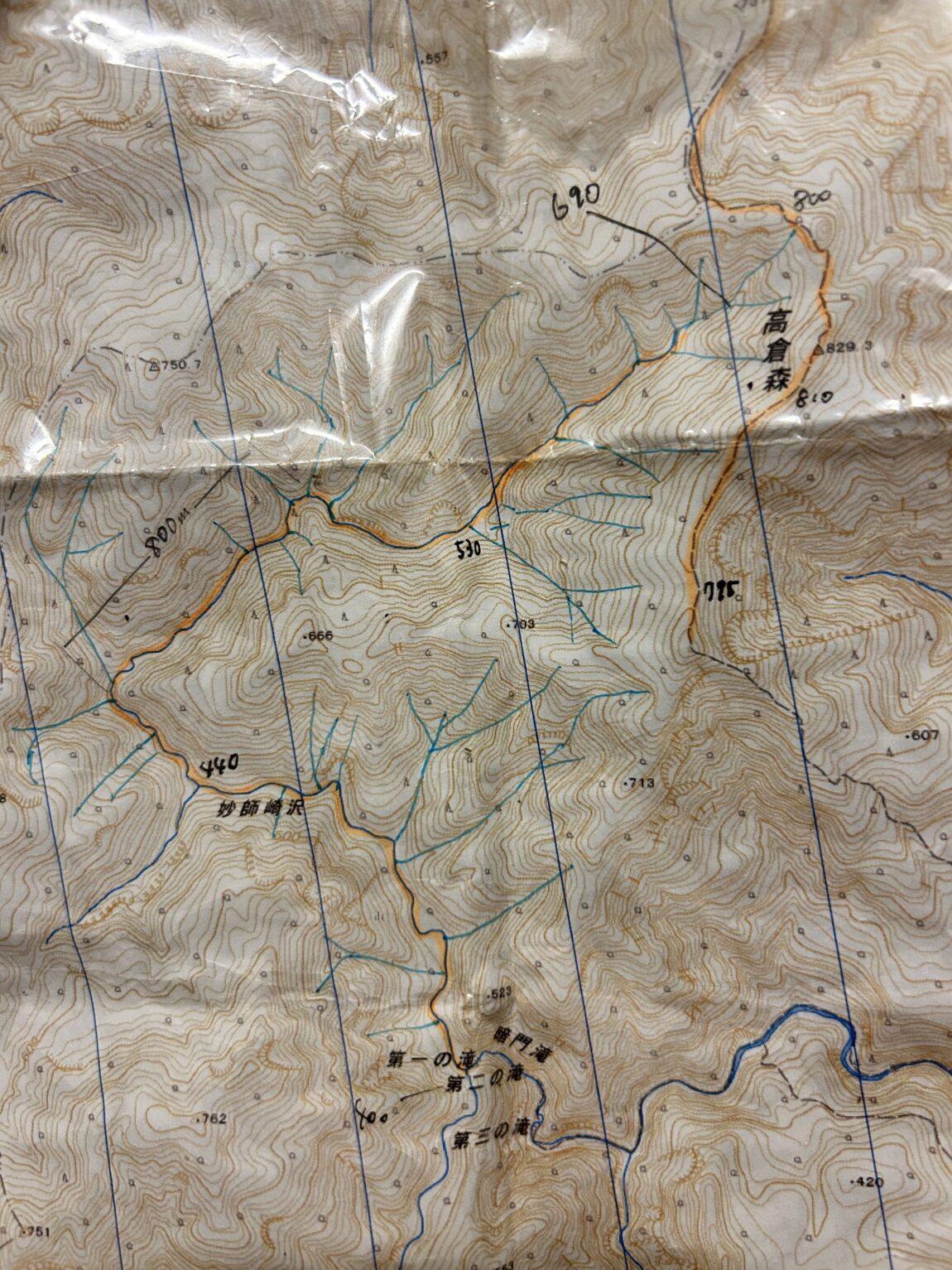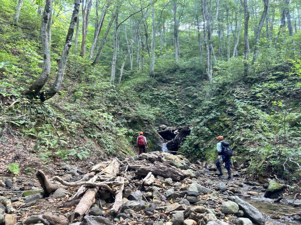 高倉森からミヨシザキ沢へ降りる。ということしか事前に聞かされていなかったため、どこまで本流を下降しどのように戻るのかわからなかった。一昨年歩いたハードトラバースマタギ道は豪雨の影響が気になるし、Oさんは「楽なルートがいいです」と言っていた。だとしたら高倉森南面を戻すのはありえないよな…などと一応予習して、歩きやすそうな支流を2、3本見当をつけた。