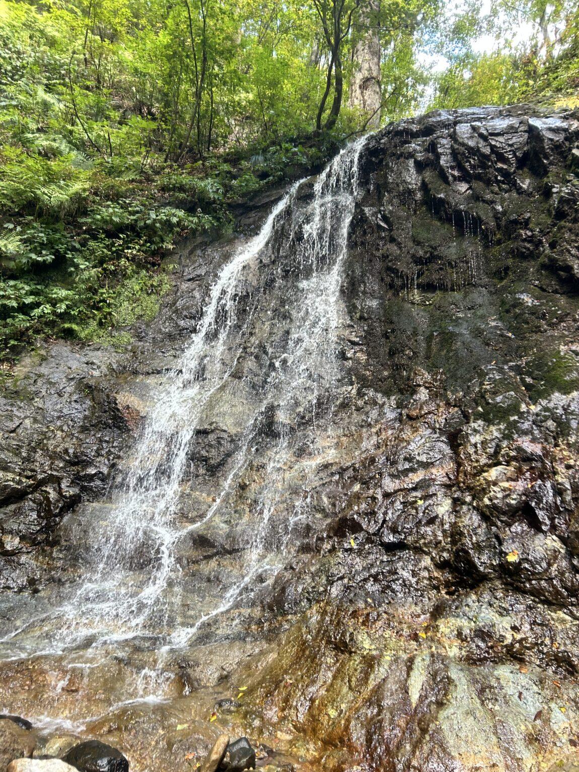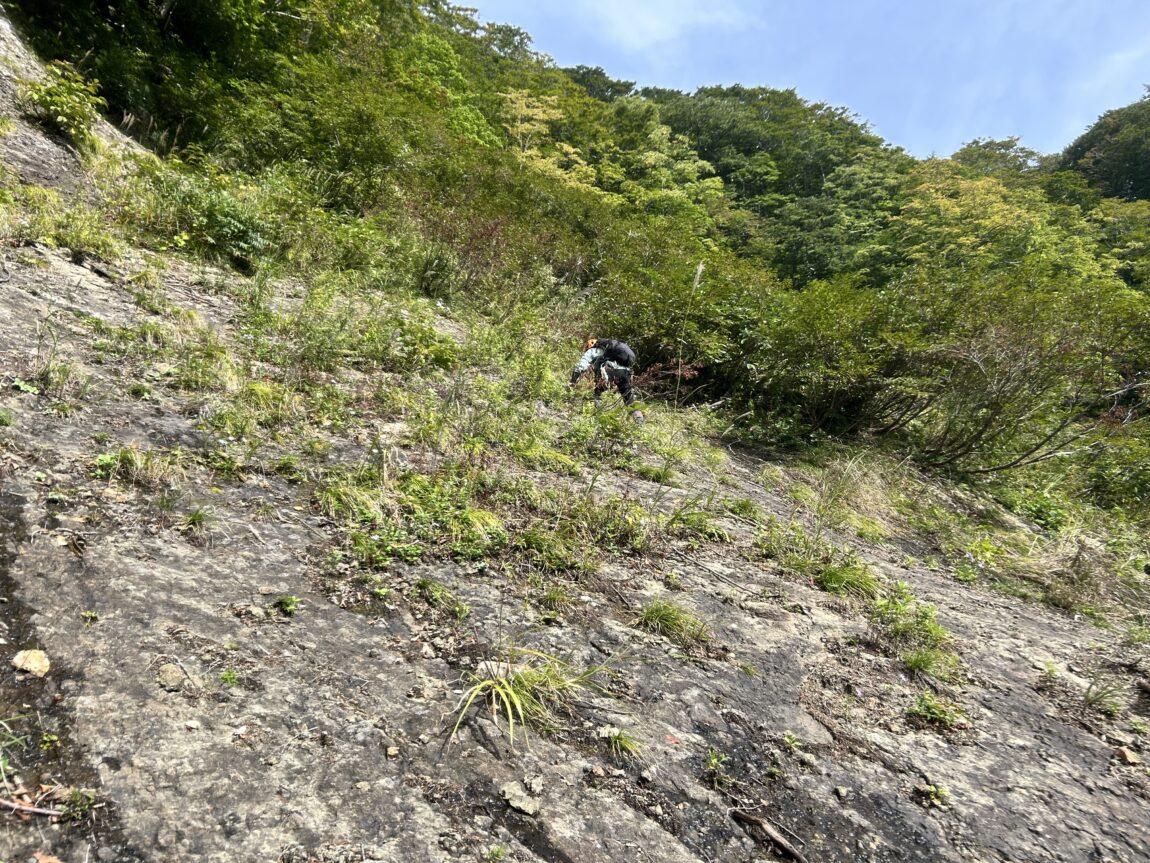 次の滝はさらに難しそうなナメ滝。左から登るのが良さそうに見えたが、oさんは右から。流石のoさんもザックを置いて空身で登攀開始。再び男性陣にスポッターをお願いし、不安なのでザックをマット代わりに二つ下に並べた。
