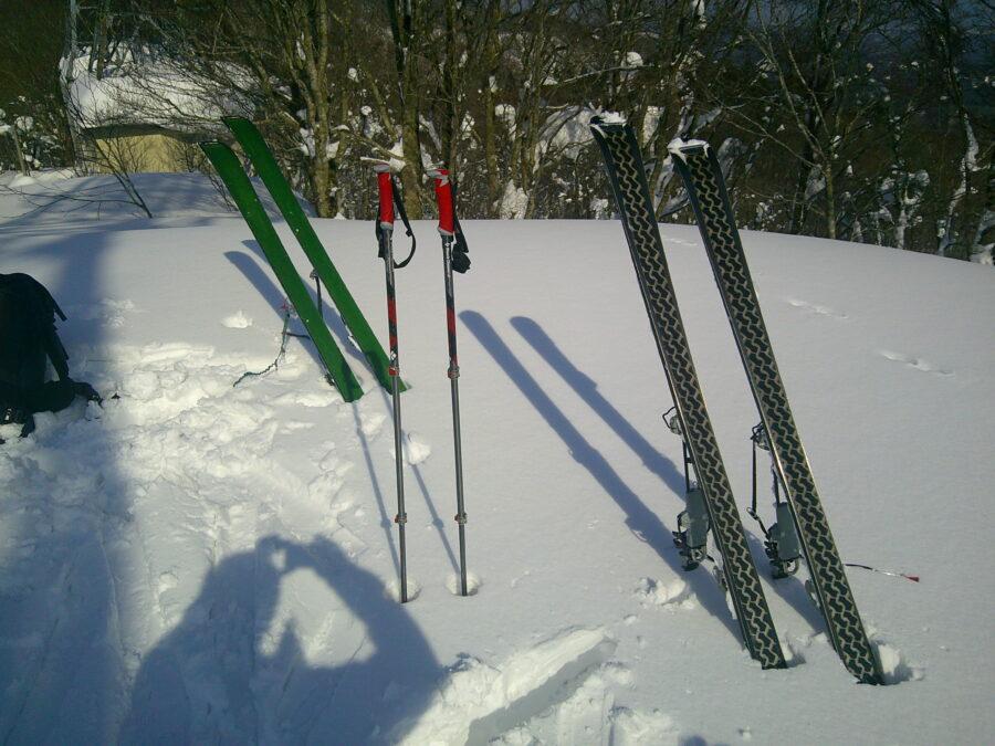 さて、午後はさらに雪が解けて重くなり、梵珠山頂への登りはバテバテでした。やっとのことで登り終え、ここからはスキーで下るのみ。下山は、斜滑降とキックターンで下山可能なサワグルミを選択しましたが、モサモサの雪質で斜滑降も難儀する始末。岩木山展望所までは、なんとかスキーで降りましたが、足腰の負担も大きく、踏み跡もしっかりしているので、スキーを担いで降りることに。しかし踏み跡を歩いても、時々、ズボッと足が埋まるので、最後はワカンを履いておりました。先月、逆川岳でぞうげさんとお会いした際、「スキーを履いて登り、ワカンで降りる」と申し上げたところ、「???」との反応を示されましたが、ほらね、実践しているでしょ?