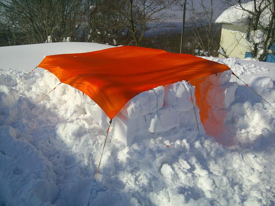 笹山に着いて、ザックからスコップを取り出して雪に挿してみると圧雪なしで雪ブロックが採れそうなので、O女史に圧雪不要と伝える。直ちに、140㎝のストックで、短辺140㎝、長辺200㎝に印をつけて雪洞内からブロックを切り出して積み、2段を積み終えるまで約15分、ペグを雪下に埋め込み、事前にタープにセットしていた自在金具に結んで張り終えるまで、都合20分で完成。昼食を1時間とすれば、40分のランチタイムを確保できます。合格かな?