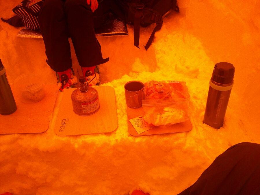 雪洞の中は広々とした空間で、4人でゆったりランチが採れます。2~3人用ツェルトでも4人でランチ可能ですが、ちょっと窮屈ですよね。中央にテーブルを備え、鍋敷きを3枚敷いて、真中の鍋敷きにガスストーブをセット。今冬、定番となったミニロースタでロールパンを温め、なんとも幸福なランチタイムでした。