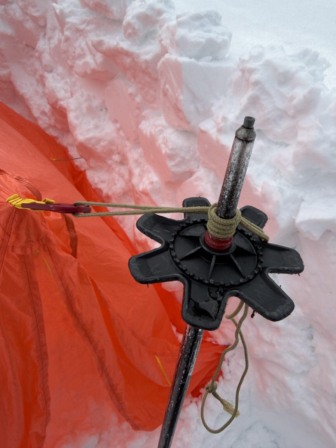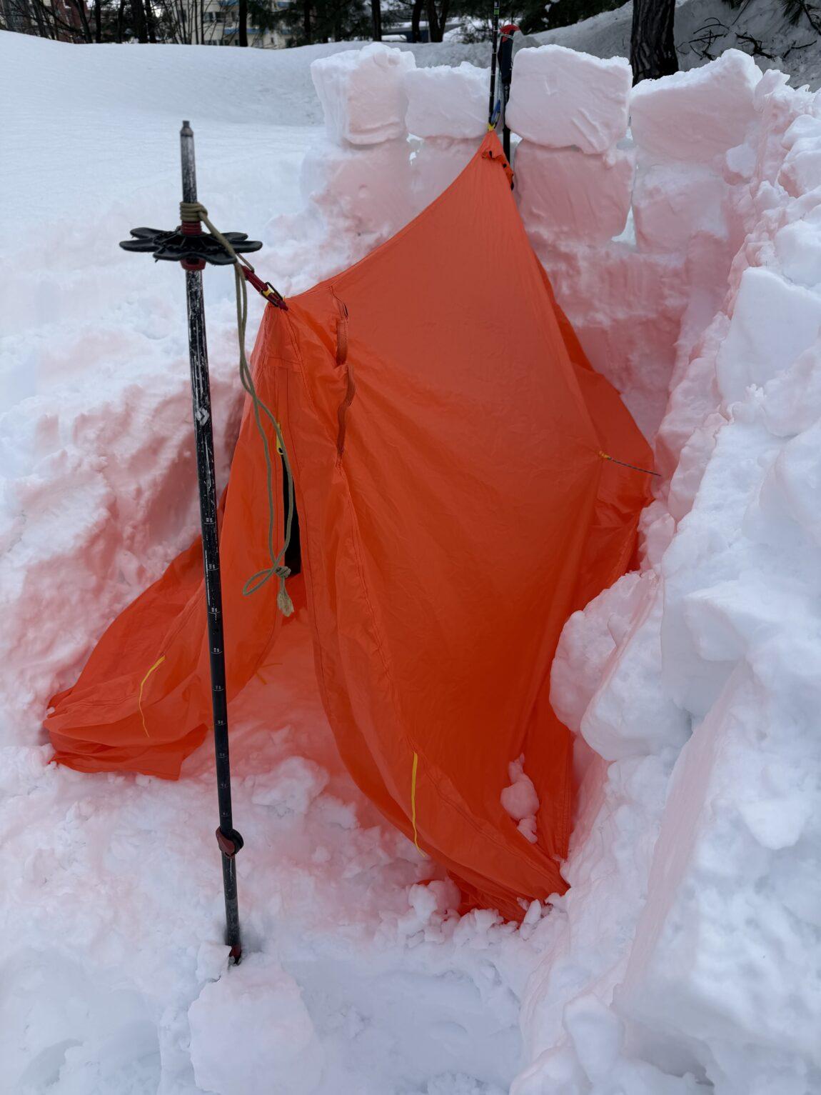 ツェルトの隅には元々長い紐の輪っかをつけてあります。逆さまにしたストックを雪にぶっ刺して、紐をクローブヒッチで結びました。ブロックを切り出すために掘り下げているので、下地はしまり雪の層なので、けっこうしっかり刺さりました。ツェルト底面四隅にも付けてある長い輪っか紐を雪の中に押し込んで固めました。あくまでも緊急時を想定しているので、十分かな。お尻の下には先日フォーラムで紹介したプラ段を敷きます。