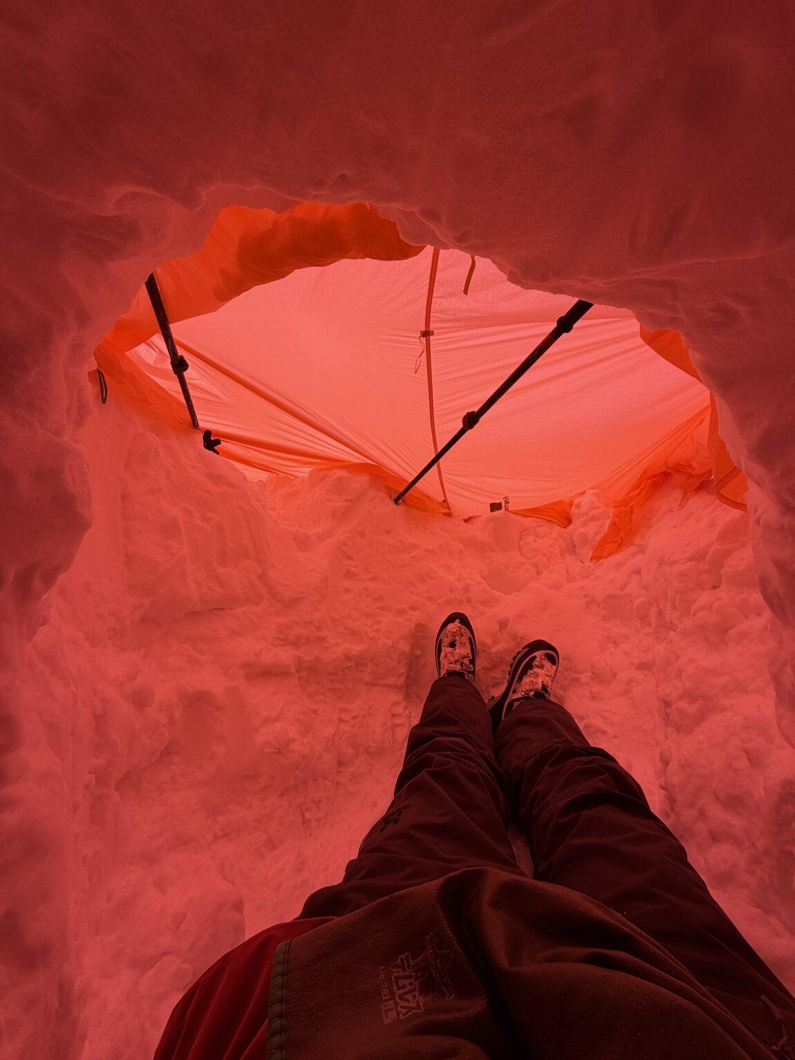 中はこんな感じ。このストックは、本来斜面に作った時に屋根になるのですが、今回はなくても良さそうでした。風は当たらないけど、冷たい空気が底に集まるので、外の方が暖かかったです。もう少し時間があれば、入り口にさらに掘り下げて冷気溜めをつくれば良いかな。