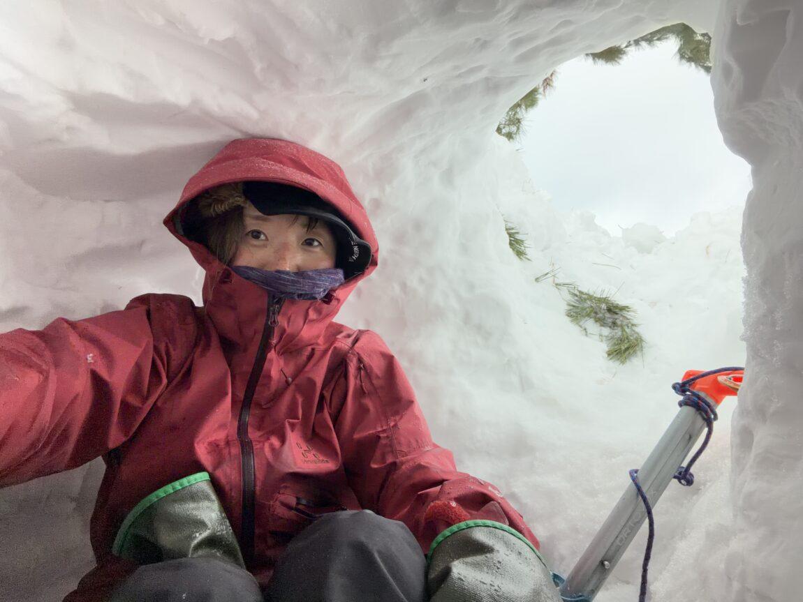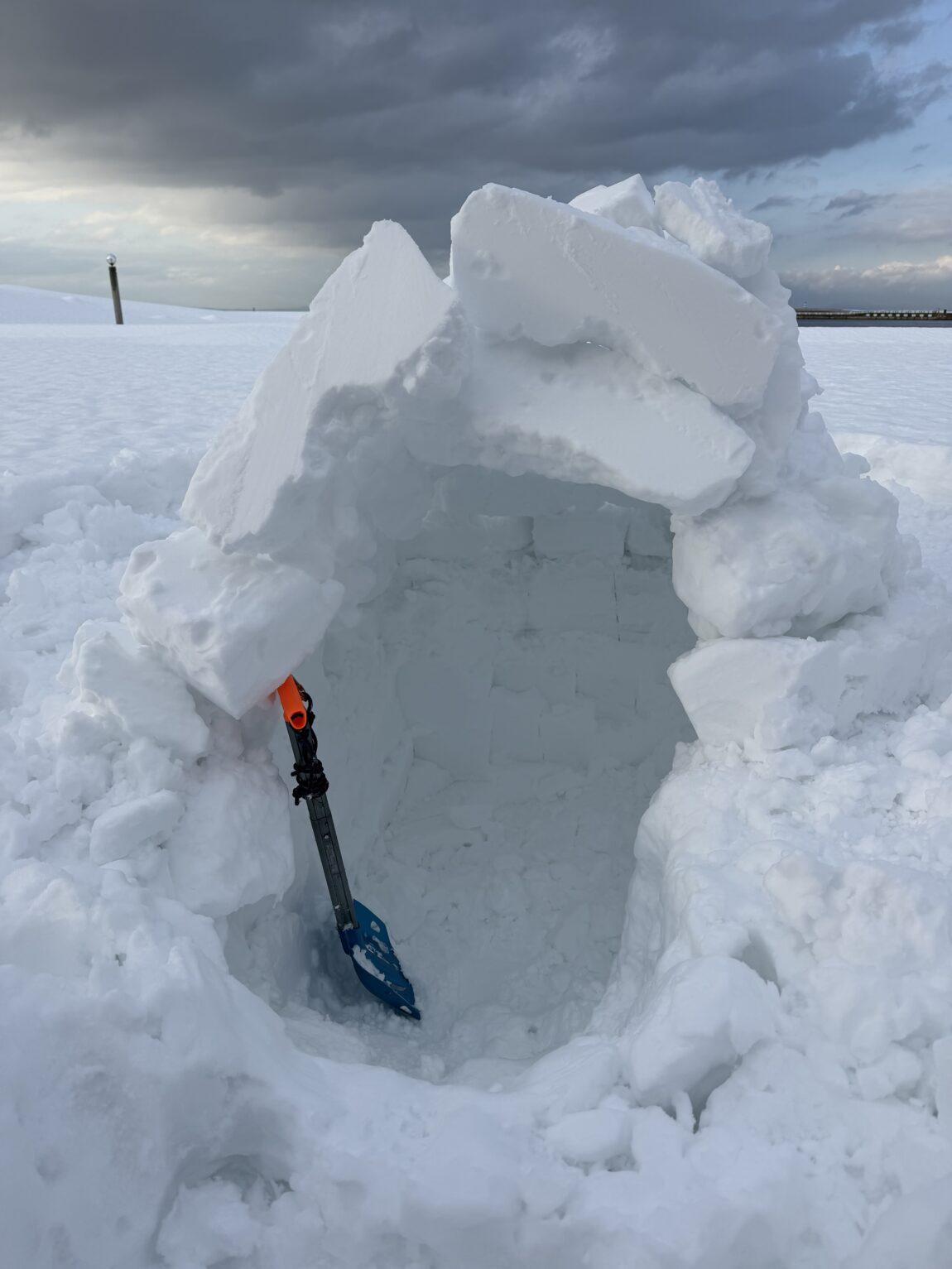 最後はイグルーを作りました。去年小山内さんの講習で作ったときは、屋根を小山内さんにかけてもらいました。なので、今回初めて1人で作れて嬉しかったです。一年前に見たイグルスキー米山さんのYouTubeを思い出しながら作りましたが、色々忘れていたので、次はもっと手際良くやれそうです。