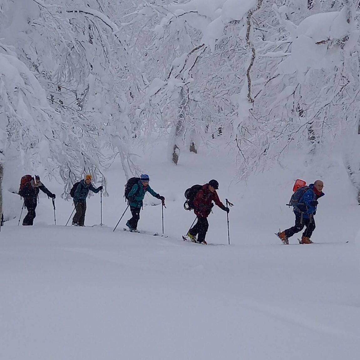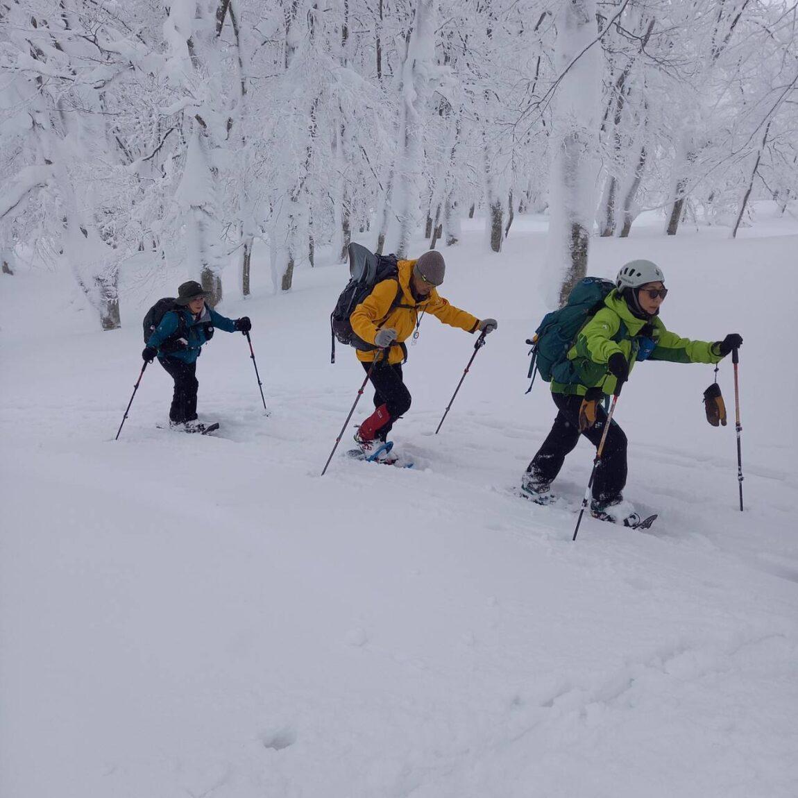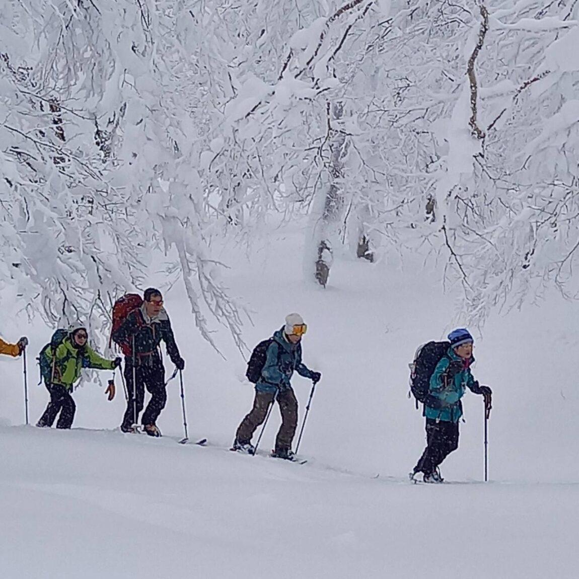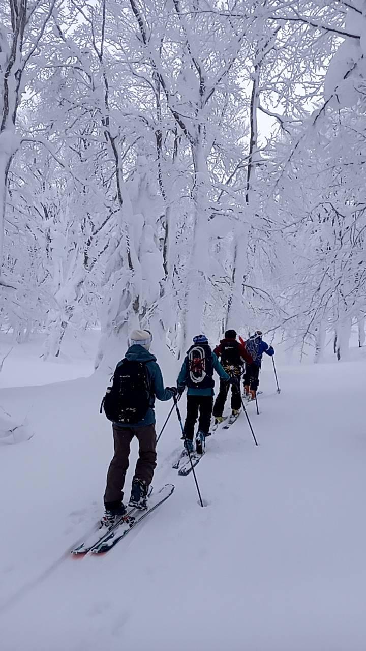 小雨のような細かな雪が降り続きますが、視界も良く、先行者のトレースをお借りして、どんどん標高をあげます。早すぎと気温高いので少し汗かきました。