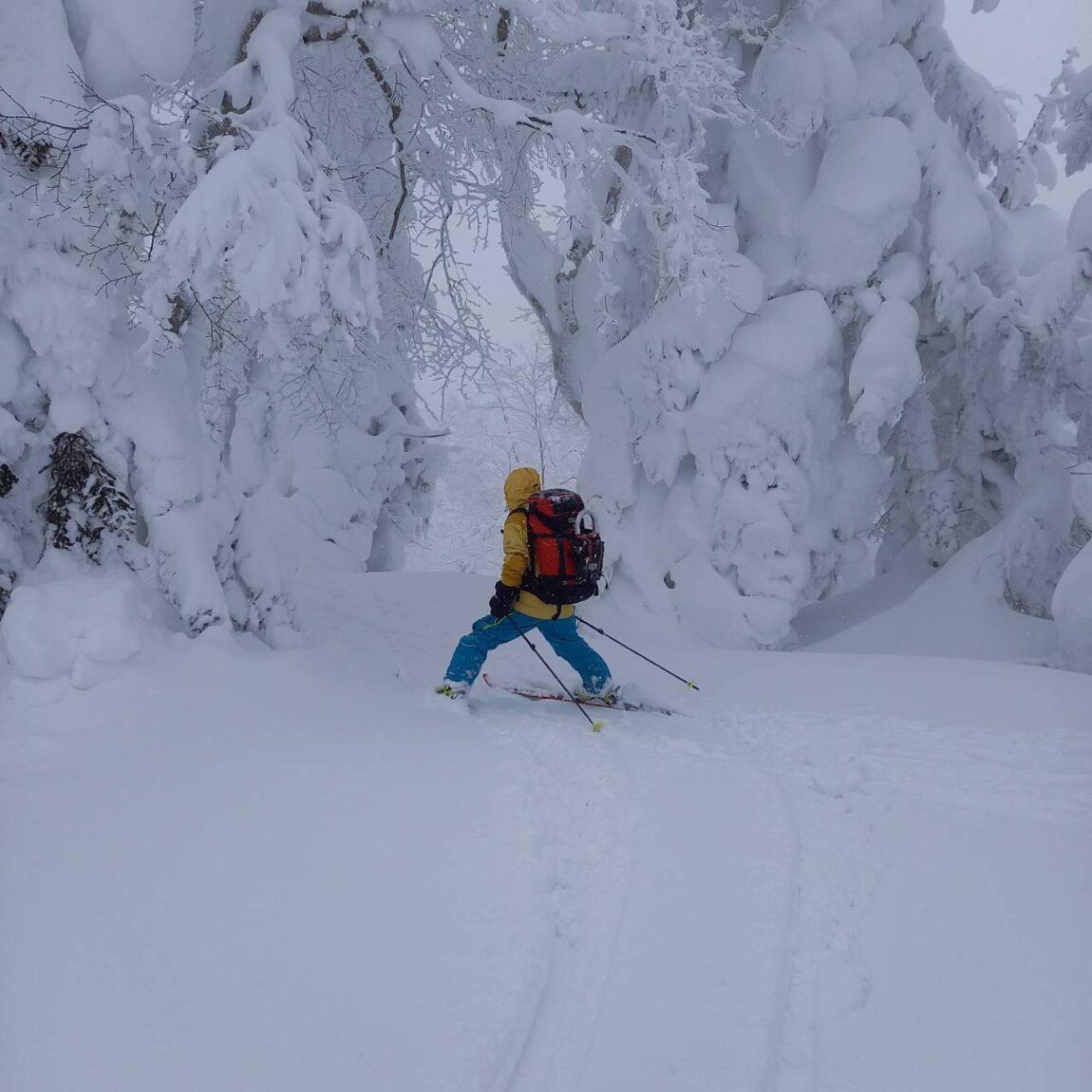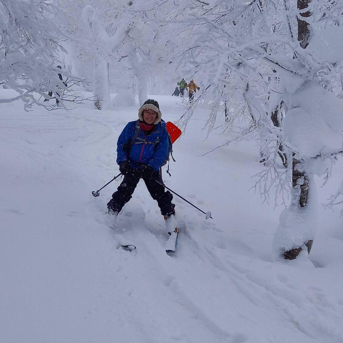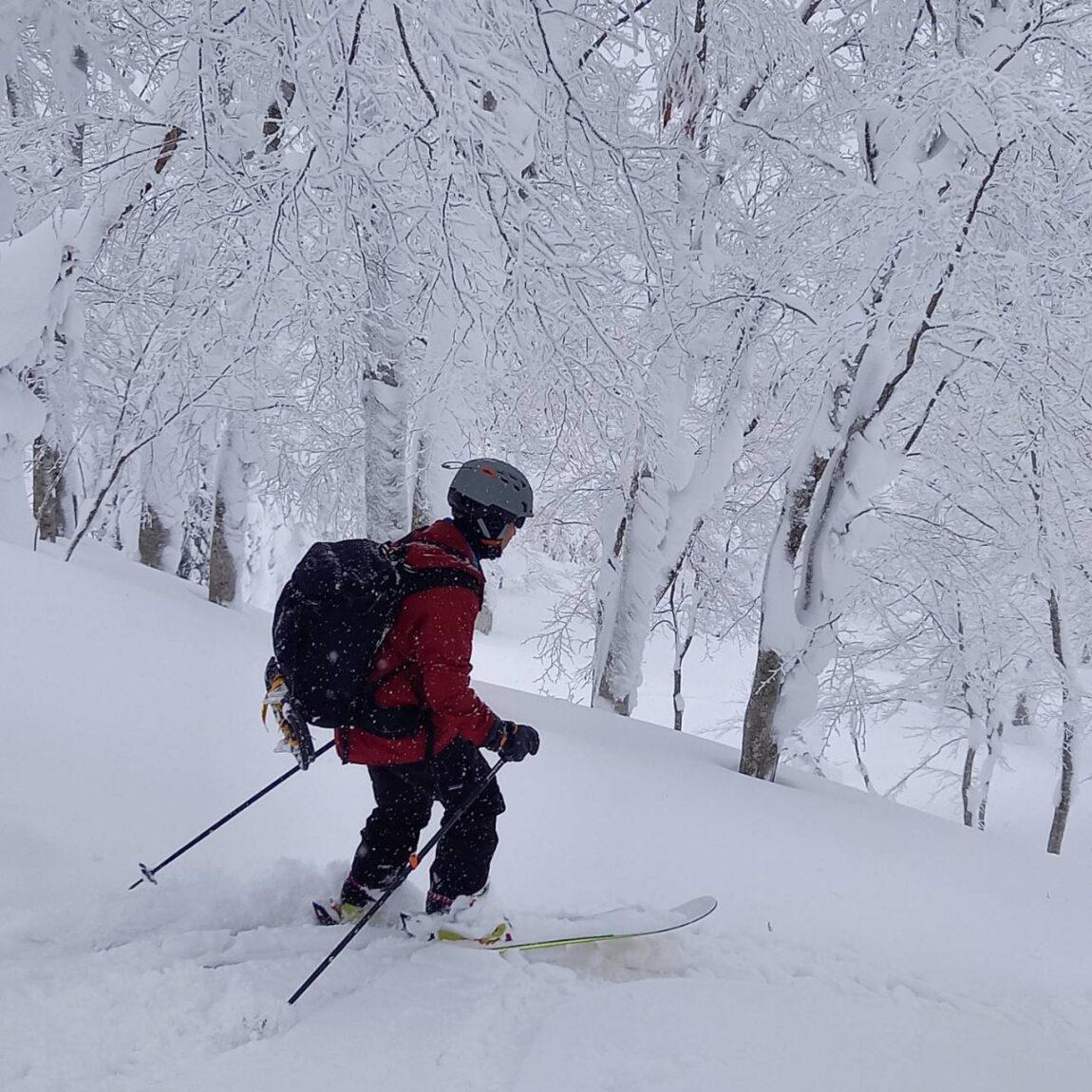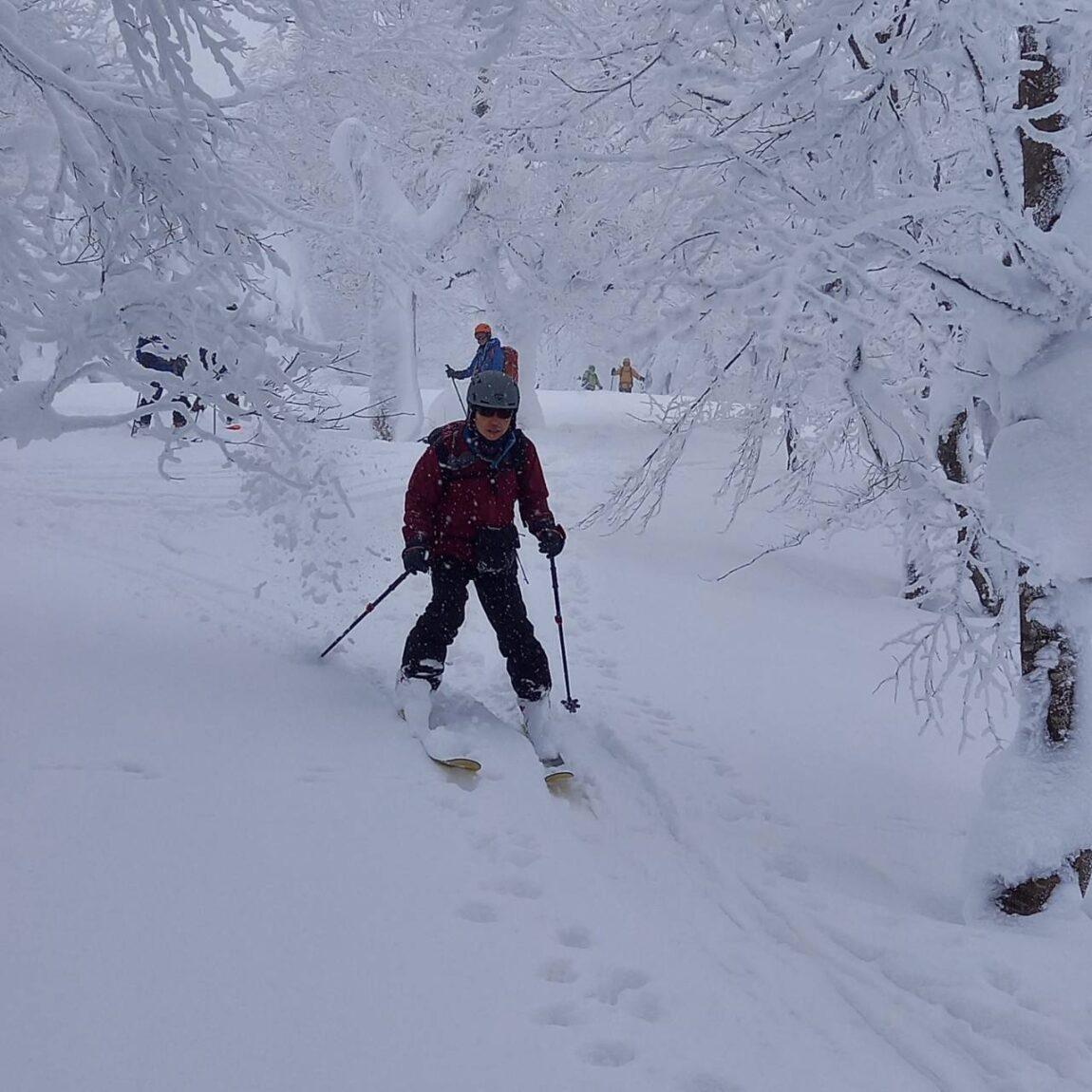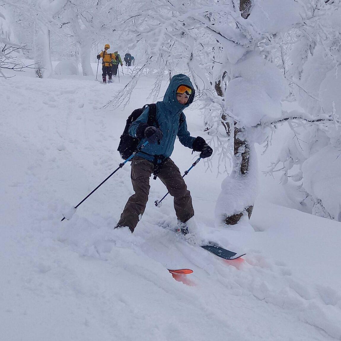 どこから来たのかsawayaさんが乱入、その後iboriさんも合流して、シール外してツリーラン。スノーシューチームもほとんど差なく下山しました。